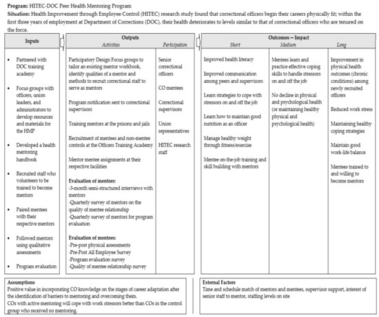 Programs supporting mentor–mentee relationships, based on consensual health-related goals, are relatively novel in the occupational health literature [32], and rarer still in corrections. In this paper, the process used to design and implement an HMP for newly hired COs is described. The HMP is distinguished by its year-long duration and its Total Worker Health emphasis on work life and well-being, going beyond job task familiarization.