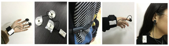 Several indicators have been proposed to measure physiological responses, e.g., to green space use. In the present study, five widely used indicators, including electrodermal activity (EDA), facial electromyography (EMG), respiration sensor (RESP), skin temperature (SKT), and photoplethysmography (PPG), were selected to measure human emotional experiences. The values of indicators were measured by the ErgoLab data platform Version 2.0, which is a set of biometric wearable sensing devices, as shown in Figure 2 [42].