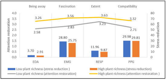 This study characterized the 13 sites into different categories according to landscape elements, including plant richness, water landscape, openness, topography, road network, and cultural landscape. As almost all sites have vegetation, it is not appropriate to discuss the impact of vegetation and non-vegetation sites on mental stress. Alternatively, plant species richness is compared to understand the intervention of vegetation on mental stress. This study compared the physiological and psychological indicators of the seven study sites with low plant richness (plant species ≤ 3) and six study sites with high plant richness (plant species > 3). Figure 4 shows that sites with high plant richness have low physiological value and high psychological value than ones with low plant richness, particularly on EMG (difference = 3.05 μV) and fascination (difference = 0.73), indicating the higher potentials of rich species on stress reduction and attention restoration.
