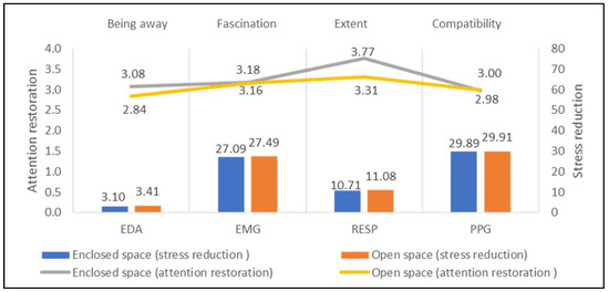 The physiological signals of enclosed spaces (3 study sites) and open spaces (10 study sites) are quite similar, as shown in Figure 6. Although the value of EDA, EMG, RESP, and PPG at enclosed space sites was found to be slightly lower than that at open spaces, their difference is quite narrow, with a value of no more than 0.4. Similarly, the difference of attention restoration between enclosed and open spaces is not significant, particularly on Fascination and Compatibility. Therefore, space openness possibly is not a vital landscape element for mental stress reduction and attention restoration in low-density contexts.