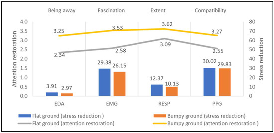 Figure 7 shows that the sites with bumpy grounds (eight study sites) presented a higher performance on stress recovery and attention restoration than the ones with flat grounds (five study sites), particularly on EMG (difference = 3.23 μV) and RESP (difference = 2.24 rpm). Sites with bumpy grounds present higher values of attention restoration than ones with flat grounds, especially for fascination. Therefore, the topography is a key landscape element for stress reduction and attention restoration that should be considered in creating a well-being environment.