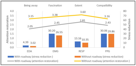 Figure 8 compares the average performance of the 3 study sites with roadways (or driveway sites) and the 10 study sites without roadways (or non-driveway sites) related to attention restoration and stress reduction. Participants close to roadways experience high pressure on EDA (4.39 μs), EMG (30.20 μV) and RESP (13.16 rpm), while the figures are reduced to 3.02 μs, 26.55 μV, and 10.35 rpm, respectively, when they visited the sites without roadways. Comparatively, sites without roadways present higher psychological values (Being Away = 1.15, Fascination = 0.93, Extent = 0.79, Compatibility = 0.73) than roadways sites.