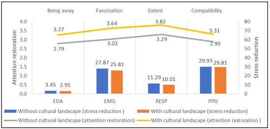 Figure 9 depicts the average attention restoration and stress reduction of 3 study sites with cultural landscape and 10 study sites without cultural landscape. Sites with cultural landscapes (Being Away = 3.27, Fascination = 3.64, Extent = 3.82, Compatibility = 3.31) present greater attention restoration than those without cultural landscapes (Being Away = 2.79, Fascination = 3.02, Extent = 3.29, Compatibility = 2.90). Meanwhile, the former has lower physiological signals than the latter. The difference between cultural and non-cultural sites can reach 2.06 μV on EMG and 0.62 on fascination. Therefore, the display of cultural landscapes in green spaces can lead to low stress levels and high attention restoration.