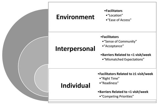 Table 2 presents the quantitative data for individual, interpersonal and environmental factors by utilization group (≥1 visit/week vs. <1 visit/week). Facilitators and barriers identified from the qualitative interviews are summarized in Figure 1 by the individual, interpersonal and environmental levels from the socio-ecological model.