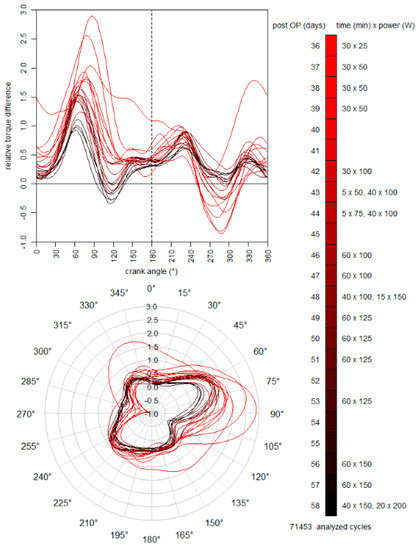 During rehabilitation, the intensity and volume of the training sessions were stepwise increased in a self-driven manner up to 200 W on the 58th day post-surgery. With the exception of the first training session, all difference curves had a similar progression with the highest positive and negative differences between a crank angle of 60–90° and 270–310°, respectively. These positions correspond to the knee extension and hip flexion phases of the rectus femoris muscle. The presented data show that the side differences in crank torque between the non-operated and operated leg considerably decrease during the rehabilitation.