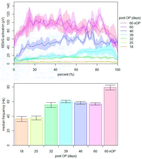 To investigate the initial healing of the muscle-tendon unit, the ability of the patient to voluntarily activate and contract the rectus femoris muscle was assessed for the first nine weeks after surgery. Between the 18th and 60th day post-surgery, the neuromuscular activation of the rectus femoris muscle was measured weekly during three maximal voluntary unilateral contractions of 5 s at an isometric position of 90° knee and hip flexion. A bipolar surface electromyography system (Noraxon Telemyo DTS, Scottsdale, AZ, USA) was used with a sampling rate of 1500 Hz. The application of the electrodes (Noraxon Dual, Scottsdale, AZ, USA) on the rectus femoris muscle was performed in accordance with the SENIAM (surface electromyography for the non-invasive assessment of muscles) recommendations [17]. The signals were rectified, time-normalized, and smoothed using a root-mean-square moving-window function with a time constant of 200 ms. Figure 2 (top) shows the mean activation of the operated muscle at different time points during rehabilitation compared to that of the non-operated side on the 60th day post-surgery. The mean of the median frequencies of the corresponding raw signals are listed at the bottom of Figure 2.