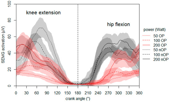 The data demonstrate noticeable side differences in the neuromuscular activation at 50 and 100 W during both the hip and knee flexion phase. However, at 200 W, the side differences decrease and a prominent difference persists only at the beginning of the hip flexion phase (upwards movement of the leg). It is noteworthy that with increasing power, the neuromuscular activation of the non-operated rectus femoris decreases during the knee extension phase.
