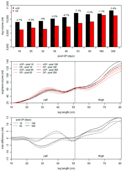 Total leg volumes of the operated (OP) and non-operated (nOP) leg (top), segment volumes (middle) and side differences (bottom) at the 18th, 60th, 186th, and 368th day post-surgery.