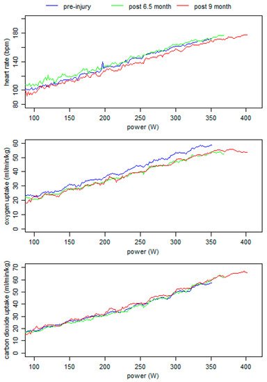 The heart rate, oxygen, and carbon dioxide uptake values of the three tests were plotted in Figure 5. The data show that the peak power output increased from the pre-injury value of 352 W to 368 W and 400 W after 6.5 and 9.0 months post-surgery, respectively. The corresponding peak oxygen uptake and heart rate values were 58.7, 54.1, and 55.9 mL/min/kg and 172, 177, and 178 bpm, respectively. Overall, the aerobic endurance performance at 6.5 months post-surgery was comparable to the pre-injury level. However, at 9.0 months post-surgery, the power output, as the most crucial key factor of endurance performance, was highest.