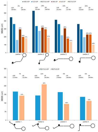 Peak neuromuscular activation (SEMG) during isometric knee extension (top) and hip flexion (bottom) of the quadriceps muscles and corresponding peak torque values at different joint positions separated for the operated (OP) and non-operated (nOP) side at one-year post-surgery. (VMO—m. vastus med., VLO—m. vastus lat., RECTUS—m. rectus fem., %—percentage side differences).