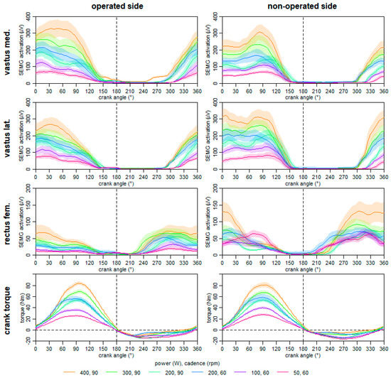 Our data display that the side comparison of the neuromuscular activation of the vastus medialis and vastus lateralis muscles revealed different shapes between the operated and non-operated leg; especially during the knee extension phase (0–60° crank angle). Moreover, the neuromuscular activation of the rectus femoris muscle of the operated leg is lower than that of the non-operated leg in the knee extension and the hip flexion phase. However, crank torque graphs of both legs show comparable shapes, whereby the amplitudes of the knee extension phase were slightly lower in the operated leg. Overall, the resulting torque of consecutive crank cycles seems to be constant and symmetrical.