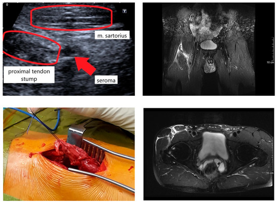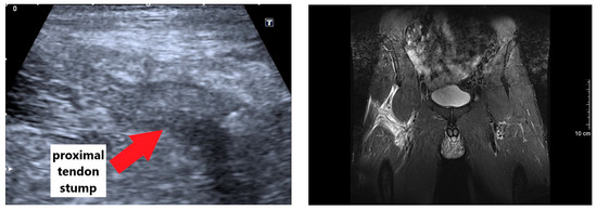 In our case report, the injury mechanism equates to one of the most commonly described injury situations in soccer [6,20]. Without the involvement of an opposing player, the kicking leg caught the ground, which leads to a sudden resistance against a forceful concentric muscle contraction [7]. This high impact change from concentric to isometric/eccentric muscle load may have overreached the maximal tolerable strain of the proximal rectus femoris muscle tendon. Within our case report, the impact of the inadequate initial treatment is unknown, but the importance of the initial therapy in muscle injuries has to be acknowledged [21]. The bearable acute pain and absence of a fall were in contrast to the severity of the injury and international muscle injury classification [16]. Thus, a fast and proper diagnosis is of crucial importance for optimal treatment. As shown in Figure 8, a safe and reliable diagnosis of a complete avulsion of the proximal rectus femoris muscle based on ultrasound images alone is difficult. As the tendon is less supplied with blood, only a small hematoma is often detectable and the severity of the injury may be underestimated [6]. However, a complete function loss, palpation of a gap, and/or retraction of the muscle during the physical examination has to be taken seriously [16]. Thereon, and as supported by our data, a fast evaluation per MRI is clearly recommend, which permits a precise localization and quantification of the injury [10,22,23]. In case of a complete avulsion of the proximal rectus femoris with a dislocation and significant retraction, a surgical treatment is recommended [24], because the effect of non-anatomical healing on muscle strength and function is currently unknown [20]. However, among other aspects, the decision has to take into account the age, previous injuries, comorbidities, and activity level of the patient. In particular, in elite athletes, a non-operative treatment may predispose the patient to a higher recurrence rate [10]. As the patient of this case study was a healthy, middle-aged, and highly active athlete, a surgical repair with a suture anchor approach was performed.
