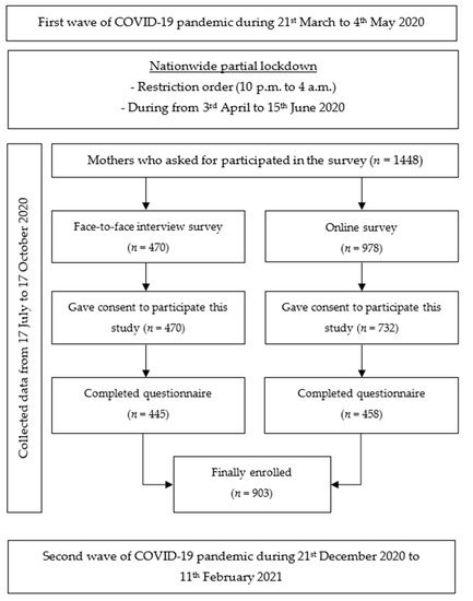 This cross-sectional study involved the recruitment of 903 women over 18 years old with an infant under 12 months of age at the time of the survey, regardless of nationality, living in Thailand during the COVID-19 pandemic. In this study, the nationwide online survey and interview questionnaire in Chiang Mai Province survey was conducted from 17 July 2020 to 17 October 2020 after the first nationwide COVID-19 lockdown period in Thailand (from 3 April to 15 June 2020) and again later—from 21 December 2020 to 11 February 2021 (Figure 1). The participants were asked retrospectively about the effects of the COVID-19 pandemic on breastfeeding practices during the lockdown.
