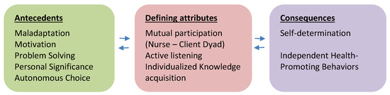 Several concept analyses of empowerment have been reported in both generic and diagnosis-specific contexts [11,12,13,14]. Ellis-Stoll and Popkess-Vawter’s model of empowerment in nursing was used as the theoretical basis for the present study [11] because it focused on empowerment as a process that can result in independent health-promoting behaviors. Ellis-Stoll and Popkess-Vawter [11] define empowerment as “a participative process through a nurse–client dyad that is designed to assist in changing unhealthy behaviors” [11]. Figure 1 outlines the antecedents, defining attributes, and consequences of their model of the empowerment process.
