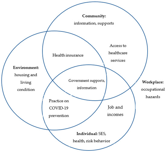 The questionnaire included information that followed the conceptual framework, including: (1) Individual information (demographic, socio-economic status (SES), employment contract, health and health risk behavior; practice on COVID-19 prevention and control); (2) Workplace: exposure to occupational hazards; job and incomes (3) Environment: housing and living condition, access to clean water, toilet, and internet; and (4) Community engagement: health insurance, access to healthcare facilities, information on COVID-19, supports to migrant workers and economic responsibility