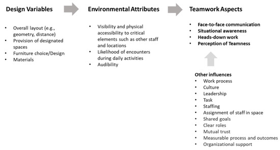 Communication is essential for effective teamwork [23,24]. Face-to-face communication, among other types, plays a critical role in most teams, including healthcare settings [25,26,27,28,29,30]. Furthermore, face-to-face communication is significantly associated with the design of the space, including proximity and visibility, while electronic communication, which is more often formal, is not as influenced by physical distance [20].
