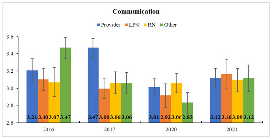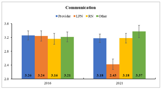 Estimated Marginal Means and Standard Errors of Communication at Clinic B. LPNs’ communication perception significantly dropped from 2016 (before COVID-19) to 2021 (after COVID-19).