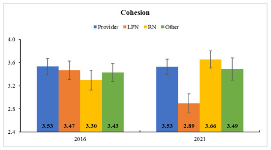 Estimated Marginal Means and Standard Errors of Cohesion at Clinic B. LPN’s self-reported cohesion was also significantly reduced from 2016 (before COVID-19) to 2021 (after COVID-19).