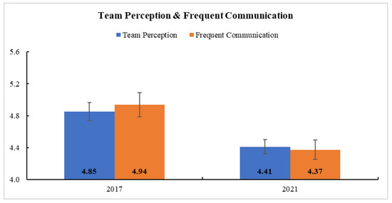 Table 2 provides the descriptive statistics of survey respondents and teamwork measures in Clinic B. In general, the teams’ teamwork, as measured by team perception, frequent communication, awareness, and timely communication, weakened after COVID-19 (i.e., from 2017 to 2021) (Table S3). Table S3 presents the model parameter estimates and Type-3 test results. The time effect was significant in GLM for team perception and frequent communication, confirming a significant reduction after COVID-19 in each of those domains (Figure 5). There was no significant interaction between time and role in their teamwork (all p > 0.05).