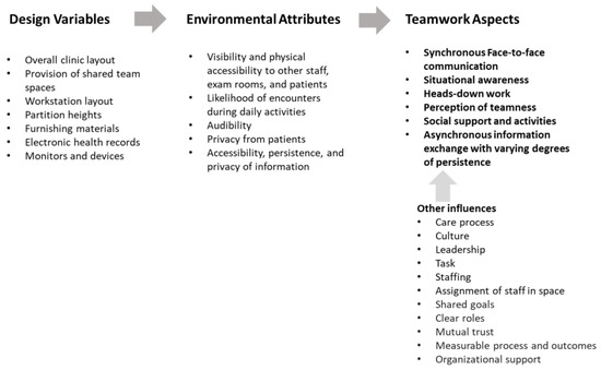 - Lim, L.; Moore, M.; DuBose, J.R.; Obeidat, B.; Stroebel, R.; Zimring, C.M. Spatial Influences on Team Awareness and Communication in Two Outpatient Clinics: A Multiple Methods Study. J. Gen. Intern. Med. 2020, 35, 1987–1996. [Google Scholar] [CrossRef]