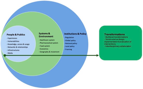 We define the social dimensions of AMR as the scalar relationship between people (their knowledge, behaviours, experiences and social networks), systems (e.g., the health system), the environment (including economics, geography) and policy-making and how they are affected by AMR, and vice versa [4]. The analytical framework (Figure 1) was developed during an expert meeting in 2019, organised through a three-year EU-funded project on integrating social sciences in epidemic threats (www.sonar-global.eu, accessed on 15 August 2021). In the meeting, we discussed the social dimensions of AMR to generate a curriculum for trainers (SPECIAL SOC AMR) [4]. Thus, the curriculum aims to guide trainers on how to instruct social scientists on the social dimensions of AMR from the biomedical scale to the global governance scale. In this case, the curriculum framework was adapted to specifically look at the social dimensions, omitting the biomedical aspects [4].