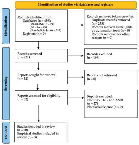 The total number of articles found during the initial search was 459 (see Figure 2). After removing the duplicates, a screening was applied to the titles and abstracts, retrieving 52 articles for full-text eligibility. In this screening process articles were only selected if their titles and/or abstracts reflected that their primary focus was AMR and COVID-19, as well as a relationship with at least one social science. Twenty-three articles were selected for analysis after applying the selection criteria. All the items included in this review were published in peer-review journals, and most of the articles (n = 20) were published expert opinions, viewpoints, commentaries or editorials. The remaining three (n = 3) presented empirical data, including qualitative methods, questionaries and time-series analysis.