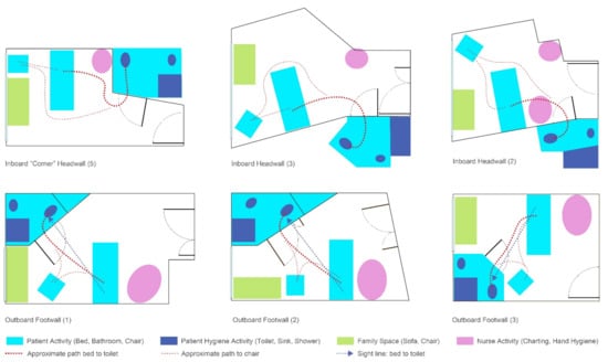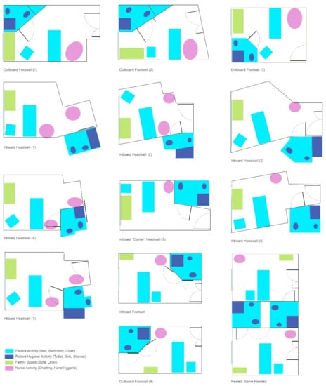 As part of their participation, the AC members were asked to share the design of a medical/surgical patient room design from a completed project. Multiple configurations (Figure 1) reflected variations traditionally found, such as inboard (bathroom next to the hallway room entry), outboard (bathroom along the exterior wall), headwall (bathroom on the wall at the head of the patient bed), and footwall (bathroom on the wall at the foot the patient bed). While some layouts had similar configurations, differences were reflected in bathroom door types (i.e., single leaf, double doors, door and relief panel, sliding door, doors with glass), as well as bathroom configurations (e.g., toilet location, grab bar locations/types). Each design was evaluated through two integrated approaches: