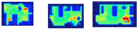 In the first phase of the AC engagement, researchers created a preliminary version of risk-based algorithm-modeled “heat maps” of each patient room (Figure 2) provided by the AC. The heat maps reflected a spectrum of “supportive” features in the room (e.g., furniture, walls, lighting), as well as trajectories of motion for common patient ambulation paths []. The heat maps did not account for the intrinsic conditions of the patient or features where levels of risk could not be quantified in the literature.