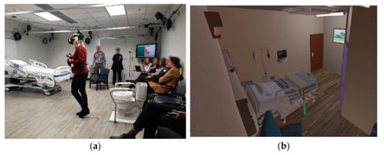 While risks for inpatient falls include intrinsic factors such as cognitive or mobility limitations, acknowledged extrinsic risk factors include physical hazards and latent conditions in the patient room design [,,]. The influence of built environment conditions as a risk factor for falls has been studied using biomechanics around the patient bed [,] and bathroom [], experimental trials of specific material interventions (e.g., flooring) [,], and the nascent development of predictive models to evaluate room design undertaken for the present study [,]. This paper represents part of a multi-year research initiative to better understand how the patient room can be designed to increase patient stability during ambulation as a fall protection strategy. Using a computerized predictive risk algorithm [], augmented reality (AR), and a survey, patient room designs were evaluated by gathering the perceptions of architects and regulators (see Table S1).