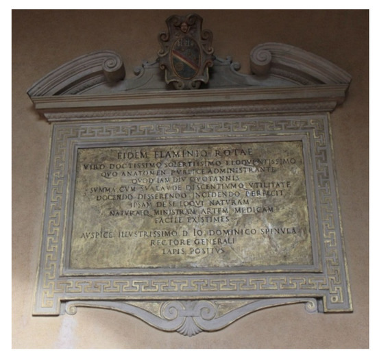 Rota was undoubtedly a praised teacher. The Palace of Archiginnasio in Bologna preserves the best evidence of the recognition of his didactic activity [8,25,26]. This palace was built in 1562–1563, thanks to the papal legate in Bologna, cardinal Carlo Borromeo, and vice-legate Pier Donato Cesi, upon the project of the architect Antonio Morandi, known as Terribilia. Under the cultural climate of the Council of Trent, this initiative aimed to provide a unitary seat to university teaching. Today, in the Archiginnasio, visitors can admire an extraordinary collection of coats of arms of the different colleges, as well as marble epigraphs in memory of professors particularly appreciated by students. In this respect, when alive, Rota was praised with six memorial epigraphs. To have an idea of the comparative value of this recognition, it must be considered that the famous anatomist Aranzio deserved eight epigraphs. Rota was appreciated because he radically innovated the anatomical teaching with interactive lessons and open discussions. Furthermore, according to Vesalius’ revolution, he gave importance to anatomical dissection. Thus, in spite of the countless inscriptions that decorated—and, in part, still decorate—the walls of the Archiginnasio, many celebrated the art of such contemporary anatomists as Flaminio Rota or Cortesi, who, in the course of public anatomy lessons, had found rapid solutions to “the very difficult objections raised extemporaneously by distinguished scholars” [26].