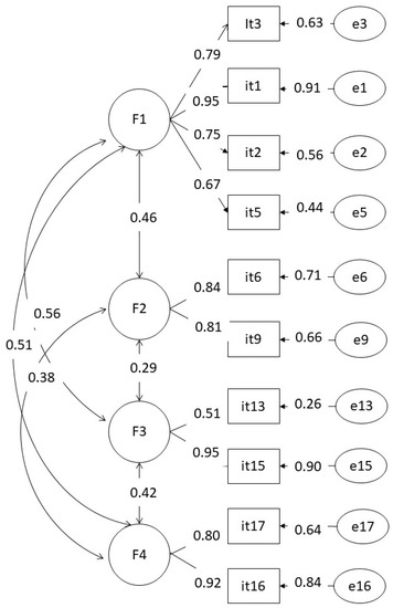 Path diagram and estimates for the four factors model suggested for this instrument.