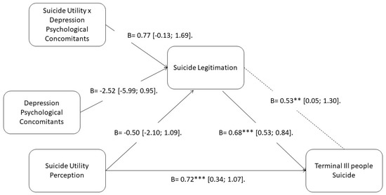 Lastly, we assessed the final model and confirmed it was statistically significant. Utility perception (X) was related to terminally ill subjects’ euthanasia (Y), through suicide legitimation (M), being these relationships mediated by depression psychological concomitants (W) (B = 0.53; SE = 0.31; 95% CI (0.05; 1.30)). When evaluating the conditional effects of our model we found that at lower levels of depression psychological concomitants, support for terminally ill people’s euthanasia was not significant (16th percentile; B = 0.29; SE = 0.28; 95% CI (−0.39; 0.77)). Nevertheless, while increasing the levels of depression psychological concomitants, the support for terminally ill people’s euthanasia increased as well (84th percentile; B = 1.04; SE = 0.29; 95% CI (0.51; 1.67)). Because of this, we have enough evidence to confirm hypothesis 3. A complete statistical model may be seen in Figure 2.