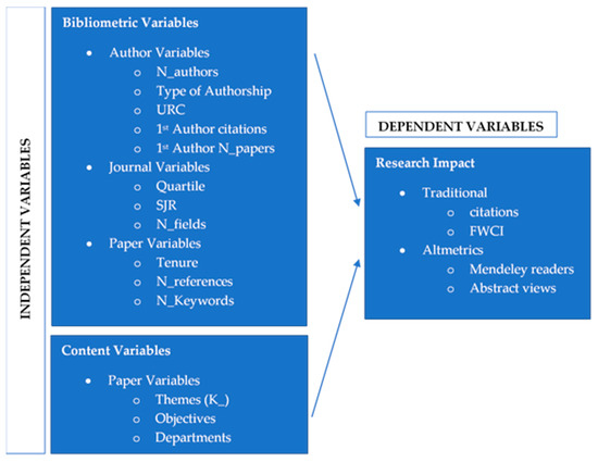 The independent variables were the determinants that may influence the research impact. These determinants are varied. Research has pointed out that bibliometric information can make the paper more remarkable, easy to find, or more visible for an interested audience [29]. Besides, the content addressed by the research, including their objectives, themes, or the methodologies applied, can also serve as an attractor for gaining readers [30].