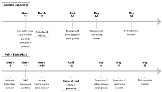 In many countries, soccer federations with medical committees prepared recommendations to support soccer teams before training and match resumption [,,,]. Most of this advice considers two basic issues: (1) How can potential infections be prevented? (2) How can infected persons proceed when they are confirmed? Carefully implemented recommendations involved social distancing, wearing masks, disinfecting hands, and systematically performing COVID-19 tests (antibody detection or real-time PCR tests). All these efforts allowed the season to be completed. German Bundesliga and Polish Ekstraklasa were among the first leagues to return to play. The first official matches after the lockdown were played by German Bundesliga after a 66-day break. In turn, Polish Ekstraklasa resumed competition 2 weeks later, on 29 May, after 81 days.