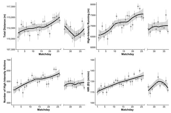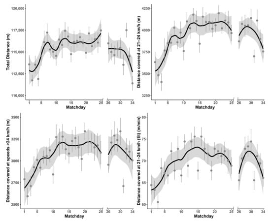 Differences between physical performances immediately after the lockdown in Bundesliga and Ekstraklasa could have been caused by the length of the lockdown and training possibility during this break. Brito de Souza et al. [] analyzed the changes in Spanish LaLiga players’ physical performance among the last four seasons and suggested that, after the usual 12-week summer break, players need approximately 8–10 matches to reach match running performance stabilization. Data from the beginning of the season in both Bundesliga and Ekstraklasa seem to confirm this statement (Figure 2 and Figure 3). The pandemic break between the matches in Poland was longer, lasting 81 days, which is very close to the 12 weeks mentioned, while German Bundesliga resumed competition after approximately 9 weeks. Moreover, in Germany, soccer players restarted the training process in small groups 40–44 days before season resumption, while in Poland, players were allowed to participate in small group training sessions 24 days and in full team sessions only 18 days before the first post-lockdown game. This short period of preparation seemed to be insufficient for the effective preparation of professional soccer players.