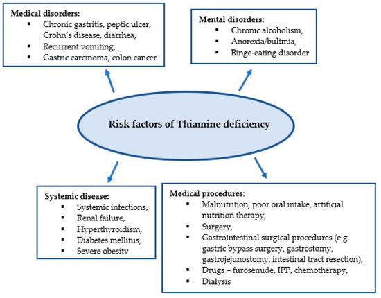 Thiamine deficiency also occurs in conditions where the supply of thiamine from food is reduced, or its absorption is impaired. These include oral and gastrointestinal cancers and surgical procedures in the gastrointestinal tract [29,30].