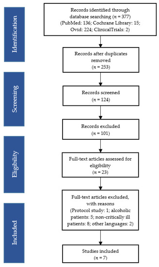 The following terms, linked to the Boolean operator “AND/OR”, were used: “delirium”, “thiamine”, “thiamine supplementation”, “thiamine supplementation in critically ill patients”, “thiamine dosage in critically ill patients”. The compiled studies were checked independently by two reviewers who analysed their titles and abstracts for inclusion criteria. The full texts of eligible reviews were then retrieved and reviewed independently by the same two researchers. The list of literature cited in the included reviews was examined and their citations, documented in the Scopus database, were also checked. Decisions on the final inclusion of the 7 studies were based on reading the full text and agreement between the researchers (Figure 2).