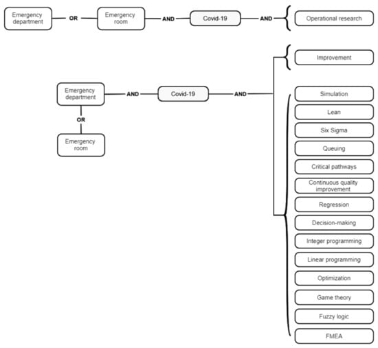 We constrained our comprehensive literature examination to full-text case articles from December 2019 (the date on which the pandemic was initiated) and April 2021 evidencing process improvement methodologies implemented by decision makers, policymakers, ED administrators, practitioners, and researchers to upgrade the response of EDs when managing COVID-19 patients. The papers had to be written in English and provide data grounding the outcomes achieved during the interventions. Research papers depicting conceptual frameworks without application in the practical scenario were not considered in this review. Additionally, conference articles, doctoral theses, textbooks, master’s dissertations, and review papers were discarded. The search strategy included the codes (Figure 1) considering the most prominent process improvement techniques identified in Ortíz-Barrios and Alfaro-Saíz [] as well as keywords related to the topic of review. The techniques included here can serve as a methodological framework supporting interventions undertaken by healthcare administrators, ED managers, health authorities, and practitioners involved in the strategic and tactic decision levels of the emergency care system. These terms are also familiar for these stakeholders as evidenced in Elamir [] (lean), Rotteau et al. [] (continuous quality improvement), Cheng et al. [] (regression), Ashour and Kremer [] (simulation), Feng et al. [] (optimization), Bellew et al. [] (critical pathways), Youseffi and Ferreira [] (decision making), Nezamoddini and Khasawneh [] (integer programming), Bish et al. [] (queuing), Blick [] (2013) (six sigma), Azadeh et al. [] (fuzzy logic), Acuna et al. [] (game theory), Sorrentino [], and Saghafian et al. [] (operational research) where real applications have been fully reported before the pandemic era with the participation of different healthcare workers, especially those from the managerial dependencies. Additionally, we performed a manual search taking into account the references related to the reviewed manuscripts. The use of the “improvement” keyword and the ample number of techniques from the industrial engineering area considered in this review also ensures a significant literature coverage granting the identification of manuscripts with great contribution to the evidence base.