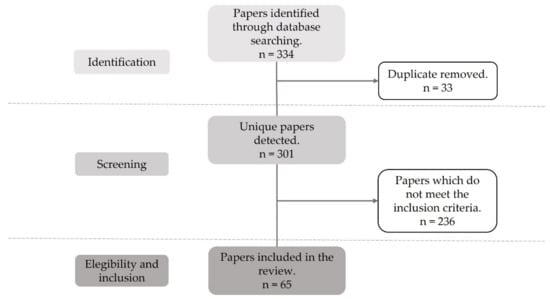 In this section, we present the results of the search and selection process based on the search codes shown in Figure 1. After removing the duplicates (n = 33), the resulting papers (n = 301) were exhaustively screened to select the relevant papers meeting the above-mentioned inclusion criteria. As a result, 65 papers were found to satisfy the inclusion requirements. Most of the discarded manuscripts were merely descriptive, did not present data supporting the intervention outcomes or evidenced approaches out of the industrial-engineering domain. The resulting PRISMA scheme can be observed in Figure 2.