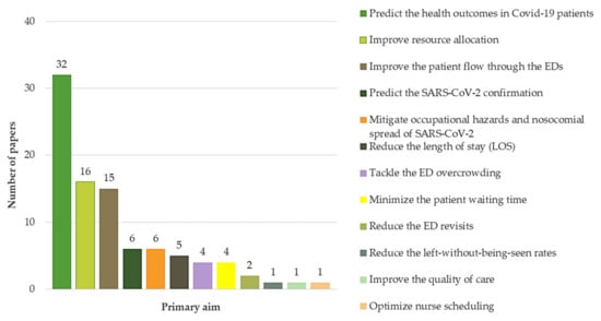 Different specific objectives have been targeted by decision makers when searching for process improvement methods upgrading the performance of EDs against the COVID-19 pandemic. In summary, 12 primary aims were identified from the related reported literature. Figure 4 depicts the most popular primary aims pursued during the implementation of the methodological frameworks (single or hybrid) outlined in Section 3.1. From Figure 4, it can be inferred that approximately half of the studies (n = 32 articles; 49.23%) aimed at predicting the health outcomes in COVID-19 patients, whereas 24.61% (n = 16 articles) focused on improving resource allocation and improving the patient flow through the EDs (n = 14 articles; 21.53%), and were ranked second and third, respectively. On the other hand, very few studies have been published regarding the following aims: (i) reduce the left-without-being-seen rates (n = 1 article; 1.53%), (ii) improve the quality of care (n = 1 article; 1.53%), (iii) optimize nurse scheduling (n = 1 article; 1.53%), (iv) reduce the ED revisits (n = 2 articles; 3.07%), (v) minimize the patient waiting time (n = 4 articles; 6.15%), (vi) tackle the ED overcrowding (n = 4 articles; 6.15%), (vii) reduce the LOS (n = 4 articles; 6.15%), (viii) predict the SARS-CoV−2 confirmation (n = 6 articles; 9.23%), and (ix) mitigate occupational hazards and nosocomial spread of SARS-CoV−2 (n = 6; articles; 9.23%).