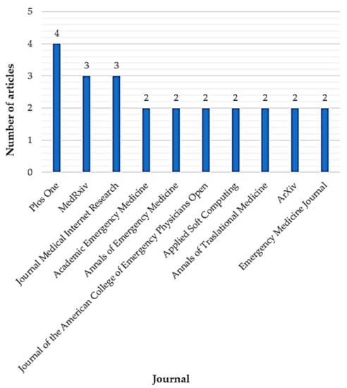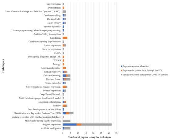 In particular, 53.65% (n = 22 articles) employed a single MLDA technique to address the operational problems of EDs during the current COVID-19 pandemic. For instance, Chopra et al. [] studied the incidence of clinical and demographic risk factors for COVID-19 patients visiting emergency rooms, using multivariate logistic regression models. The results achieved in this work highlighted the importance of using the serum biomarker data to stratify COVID-19 patients into different levels of severity. Another related study was reported by Plante et al. [] who developed a machine learning model to rule out COVID-19. In a similar vein, Sung et al. [] confirmed that early and appropriate identification and isolation of patients with suspected COVID-19 is essential to enable timely treatment, optimize resources, protect patients and healthcare workers, and prevent the spread of COVID-19 in healthcare facilities. In this respect, univariate and multivariate logistic regression were used for patient prediction and risk scoring as a complementary tool to help clinicians in triage, quarantine, and testing of suspected COVID-19 patients. Likewise, Nguyen et al. [] employed a nomogram to identify prognostic factors to predict patient risk and subsequently support the early detection of patients at risk of worsening, improve clinical care, and set out focused therapies. Furthermore, COVID-19 brought about a change in the practices performed in the ED, increasing the workload in such a way that a new distribution is generated; in this regard, Liu et al. [] proposed an intelligent quarantine station reducing the processing times experienced along with the ED patient journey. Other works presenting solutions from the MLDA domain can be consulted in Kirby et al. [], Joshi et al. [], and Van Klaveren et al. [] who performed a logistic regression model to identify variables associated with discharge appropriateness and optimization of healthcare ED resources during the pandemic. Other useful single-approached proposals can be found in Alfaro-Martinez et al. [], Freund et al. [], Brendish et al. [], Esposito et al. [], Gordon et al. [], Levine et al. [], Carlile et al. [], and García de Guadiana-Romualdo et al. [].