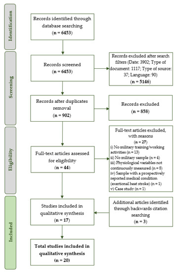 In this next phase, each manuscript was analysed to determine its accordance with the eligibility criteria. As a result, 13 articles were excluded for not involving any military training or operational conditions. Four studies were eliminated for not including a sample of regular military elements. Eight studies did not include any continuous measurement of physiological variables. Finally, two items were filtered for not involving healthy subjects and being identified as a case study. Following this process, it was possible to identify 17 relevant publications. A further three studies were obtained from backward reference searching of the 17 included studies. Therefore, 20 articles met the inclusion criteria and were selected for the systematic review. Figure 1 provides an overview of the number of articles identified at each stage delimited by the PRISMA methodology [35].