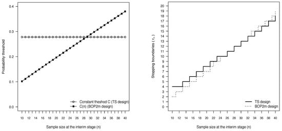In the left panel of Figure 1 we show the behavior of the calibrated thresholds C and as a function of the current sample size n. Differently from the threshold used in the TS design, that remains constant, the threshold of the BOP2m design increases as data accumulate: it is smaller than C for very low values of n and exceeds C when n approaches the maximum planned sample size. As a consequence, the BOP2m design makes it harder to terminate the trial at early stages of the study, while it is easier to stop at later stages, as it is evident looking at the right panel of Figure 1 where the stopping boundaries of both the designs are represented.