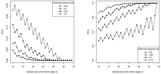 It can be interesting to investigate how the predictive probability is affected by the ratio between the amount of current information and the weight of future data, with the aim of better understand the behavior of the stopping boundaries of the LLm design as n increases. Let us refer again to the trial settings considered in the previous section: , , , and . In practice, the experimental treatment is considered sufficiently promising if exceeds , under the prior assumption that is centred on 0.4 and varies in the interval with high probability. Moreover, we assume that the study is monitored continuously end set the probability threshold equal to 0.8. We consider fixed values for the observed response rate obtained at the interim stage and, for each value of n between and , we compute the corresponding predictive probability of interest. In the left panel of Figure 2, we show the behavior of as a function of n for low values of the fixed response rate observed ad interim, while in the right panel higher values of the current response rate are considered. First of all, let us notice that the saw-toothed behavior of in both the graphs is a consequence of the discrete nature of the predictive distribution of future data []. Moreover, as expected, the larger the response rate supposed to be observed out of n patients, the higher the predictive probability of a positive conclusion at the planned end of the trial. More importantly, we can note that in the left panel of Figure 2, even if there are some small fluctuations, the shape of is basically decreasing. The fixed observed response rate can be obtained for different couples of the observed number of successes and the current sample size n. For instance, when it is equal to 0.4, we have that is equal to 0.0763, 0.0069, and 0.0000 for equal to 4/10, 8/20 and 12/30, respectively. In practice, if n is small, there is still a high number of patients to be enrolled and, even if the observed response rate is low with respect to the design expectations, there is a non-negligible predictive probability that the study will conclude in favor of the experimental therapy. Instead, when n increases and the same response rate is obtained, the number of potential future patients decreases and it becomes very unlikely that the experimental treatment will be claimed sufficiently promising at the conclusion of the trial. The current information, in fact, has a stronger impact on the value of as the future sample size decreases. The basically increasing behavior of shown in the right panel of Figure 2 can be explained with an analogous reasoning. If the fixed response rate registered at the interim stage is high, as the number of future patients decreases, we have a stronger confidence that the superiority of the experimental treatment will be claimed at the scheduled end of the trial. This explain the behavior of .