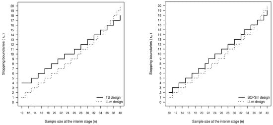 Comparison of stopping boundaries (TS vs. LLm (left panel) and BOP2m vs LLm (right panel)), when , , , , and the nominal level for the type I error rate is 0.1.