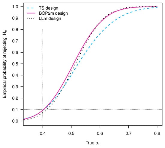 Behavior of the empirical probability of rejecting for different values of the true , when , , , , and . The stopping boundaries used are provided in Section 3.1, Section 3.2.1 and Section 4.1.1 for the TS, the BOP2m and the LLm designs, respectively.