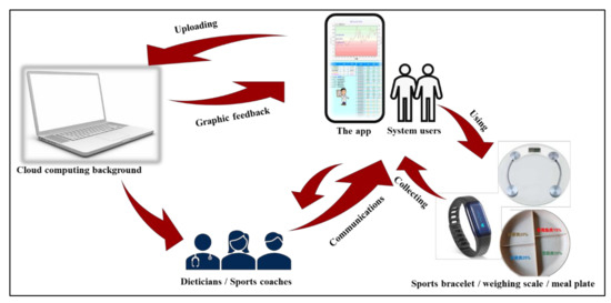 The mobile-based support system connects system users remotely with dieticians or sports coaches who could get users’ relevant information through cloud-based platform, including dietary intake, physical activity, weight, and so on. System users can set their weight and steps goals after logged in the APP. The weighing scale and sports bracelet are linked to the mobile phone via Bluetooth, which automatically uploads data of weight and steps to the APP. Users wear a sports bracelet and weigh themselves every day. After comparing the data with goals, the APP will generate graphic feedback and recommendations, such as “To be hard”, “Can be better”, or “Good, keep it up”. Moreover, users could upload the food logs and pictures of their food eaten everyday with standardized meal plates using the APP. Dieticians or sports coaches in the background make personalized dietary or exercise guidance to users through individual sessions via WeChat or phone calls based on relevant information. Users can also consult their dieticians or sports coaches at any time if they have problems. Details of the system are presented in Figure 1.