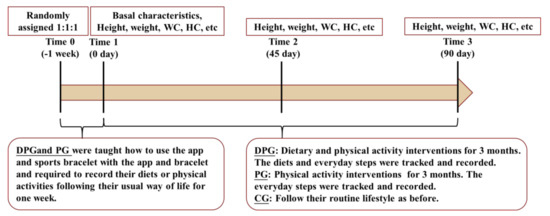 One week before the study began (Time 0), investigators helped participants in DPG and PG download the APP and register. Participants in DPG were taught how to record their daily dietary intake and physical activities or steps correctly with the APP and bracelet. Participants in PG were only taught how to record their daily physical activities or steps correctly. In addition, both groups were instructed how to use weighing scale linked to the APP. To guarantee that participants had a good command of the system, they were required to record their food intake or physical activities following their routine way for a week.
