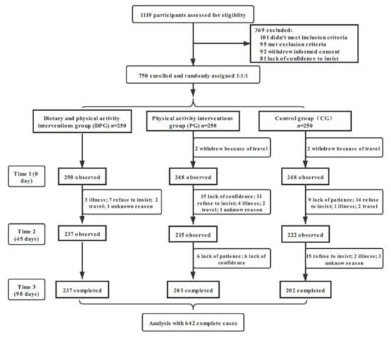 A total of 750 participants were included in this study, details of the sample size calculation could be seen in the protocol [20]. All included participants were randomized with a 1:1:1 allocation ratio according to a random number table, with 250 per group. Dietary and physical activity interventions group (DPG) received mobile-based dietary and physical activity interventions, physical activity interventions group (PG) received mobile-based physical activity interventions, while control group (CG) received no interventions and followed their lifestyle as before.