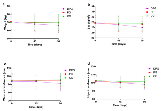 At Time 2, participants in DPG lost more weight than those in PG and CG (−1.6 kg vs. −0.9 kg; −1.6 kg vs. −0.7 kg; p < 0.05), so was BMI (−0.6 kg/m2 vs. −0.3 kg/m2; −0.6 kg/m2 vs. −0.3 kg/m2; p < 0.05). Compared to CG (−1.3 cm), HC in DPG decreased significantly by −2.0 cm (Table 3 and Figure 5).